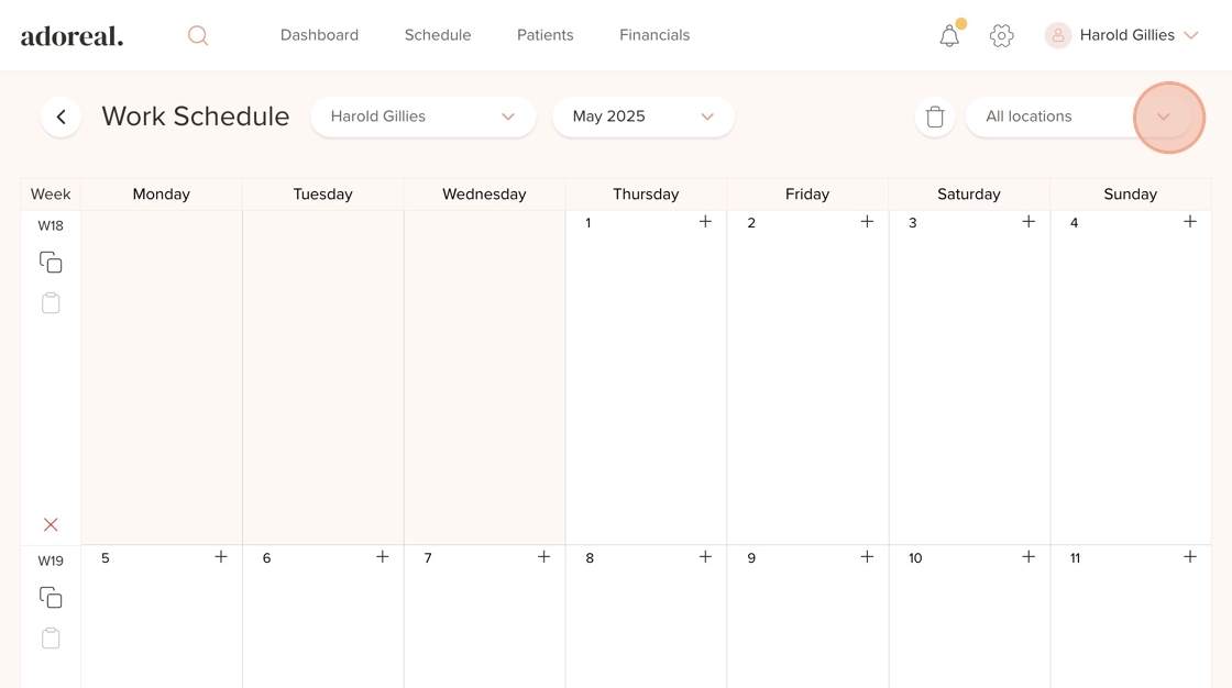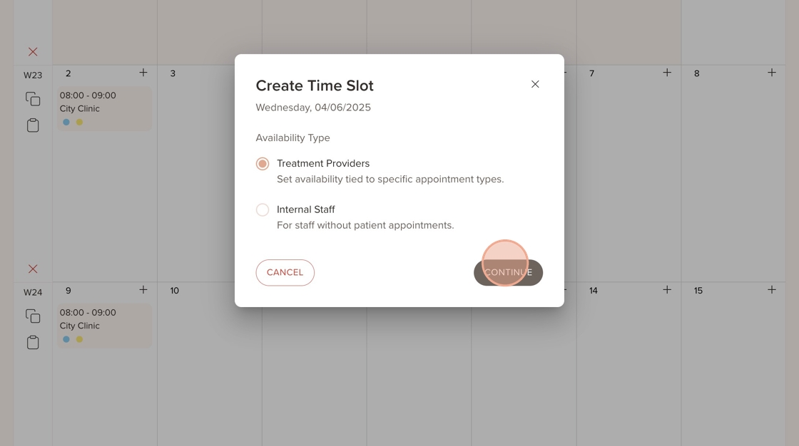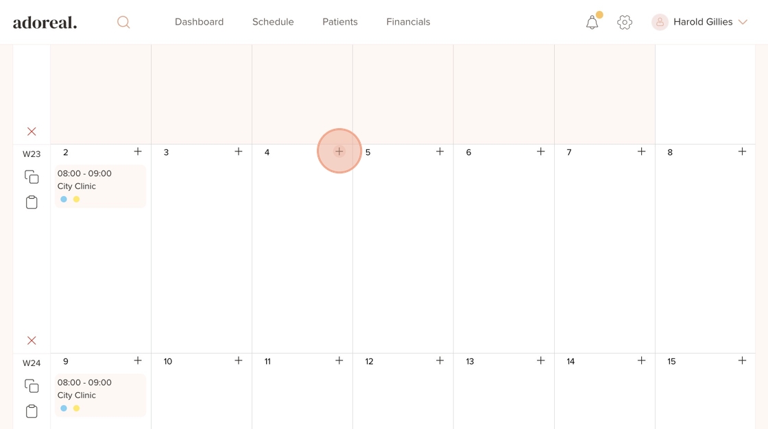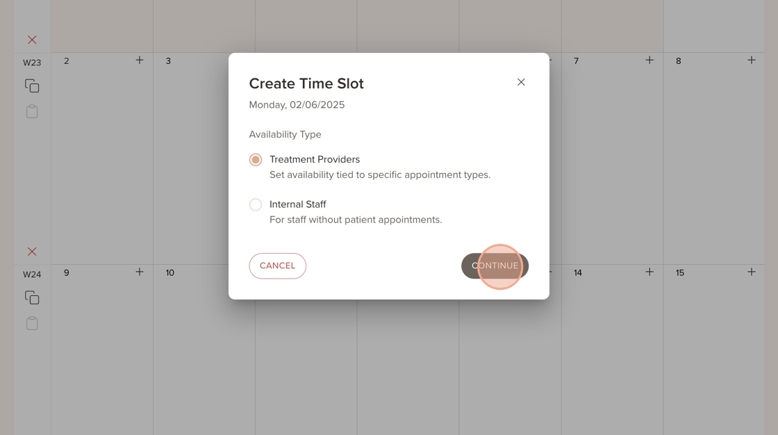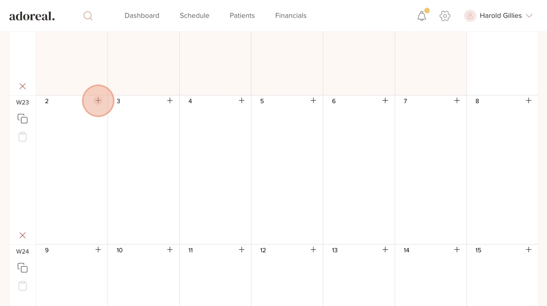 19. Go to a different day in the schedule, click the “+” icon, and select “Treatment Providers”