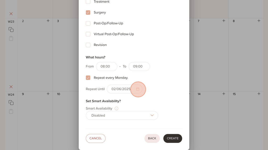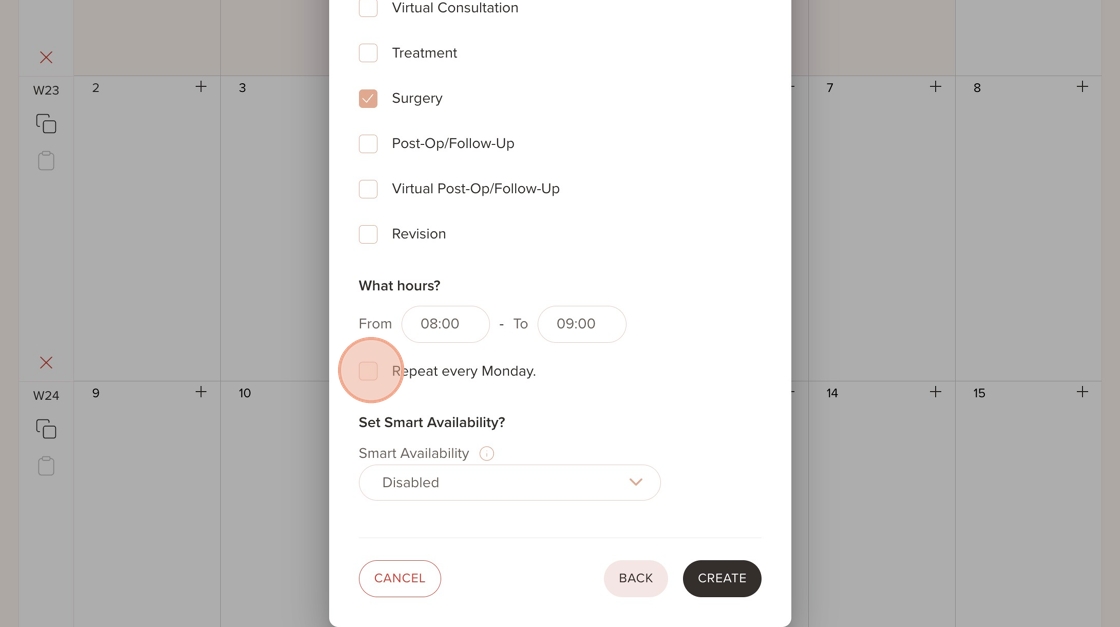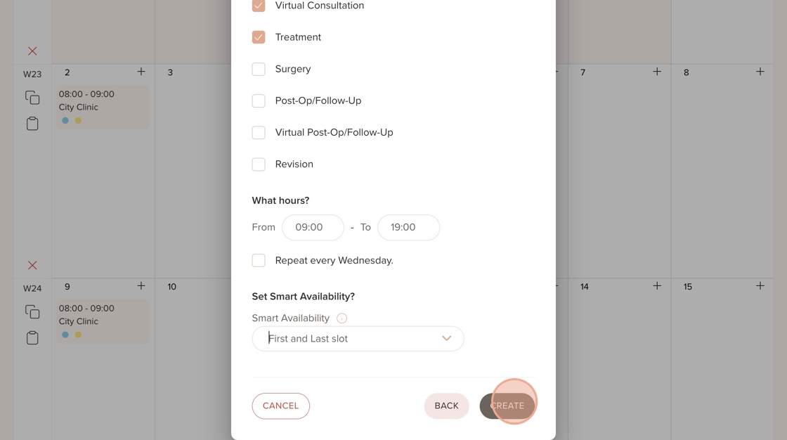 Smart Availability is especially useful for maximising schedule efficiency and reducing gaps in a provider's calendar. Instead of letting patients book any open slot during the day which can lead to gaps between appointments, this ensures that patients are only shown the earliest or latest available time slots within a provider’s working hours.