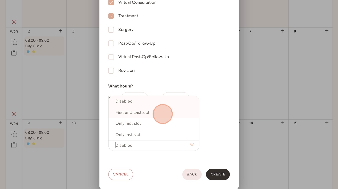 24. This is called "Smart Availability", which means that if you select the 'first and last slot' option, and set available hours from 08:00 to 17:00, the patient will be able to book an appointment at the first available hour (08:00) and then at the last available slot (e.g., 16:30–17:00).