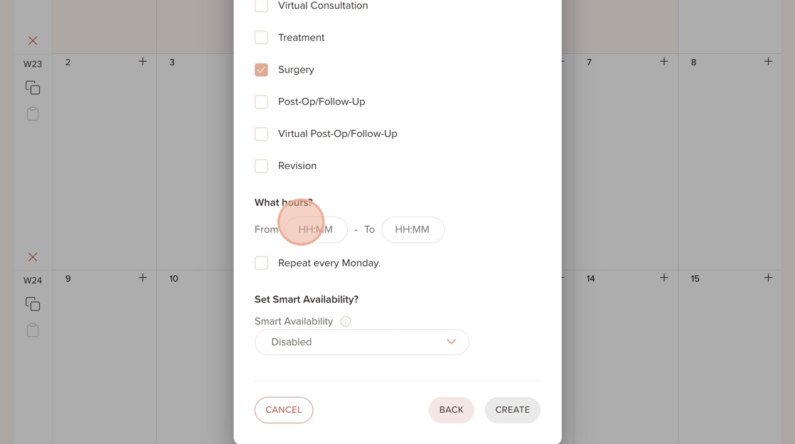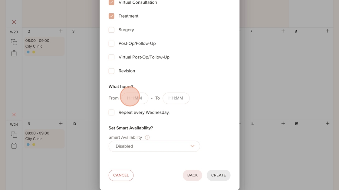 22. Click the "HH:MM" field and enter the start and end time for the availability