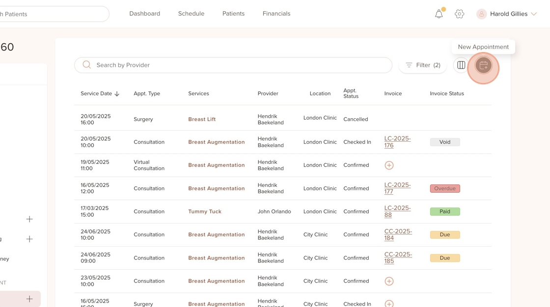2. Located in the top right corner of the bookings section. From here, you can directly create a new appointment for the patient without leaving the profile view.