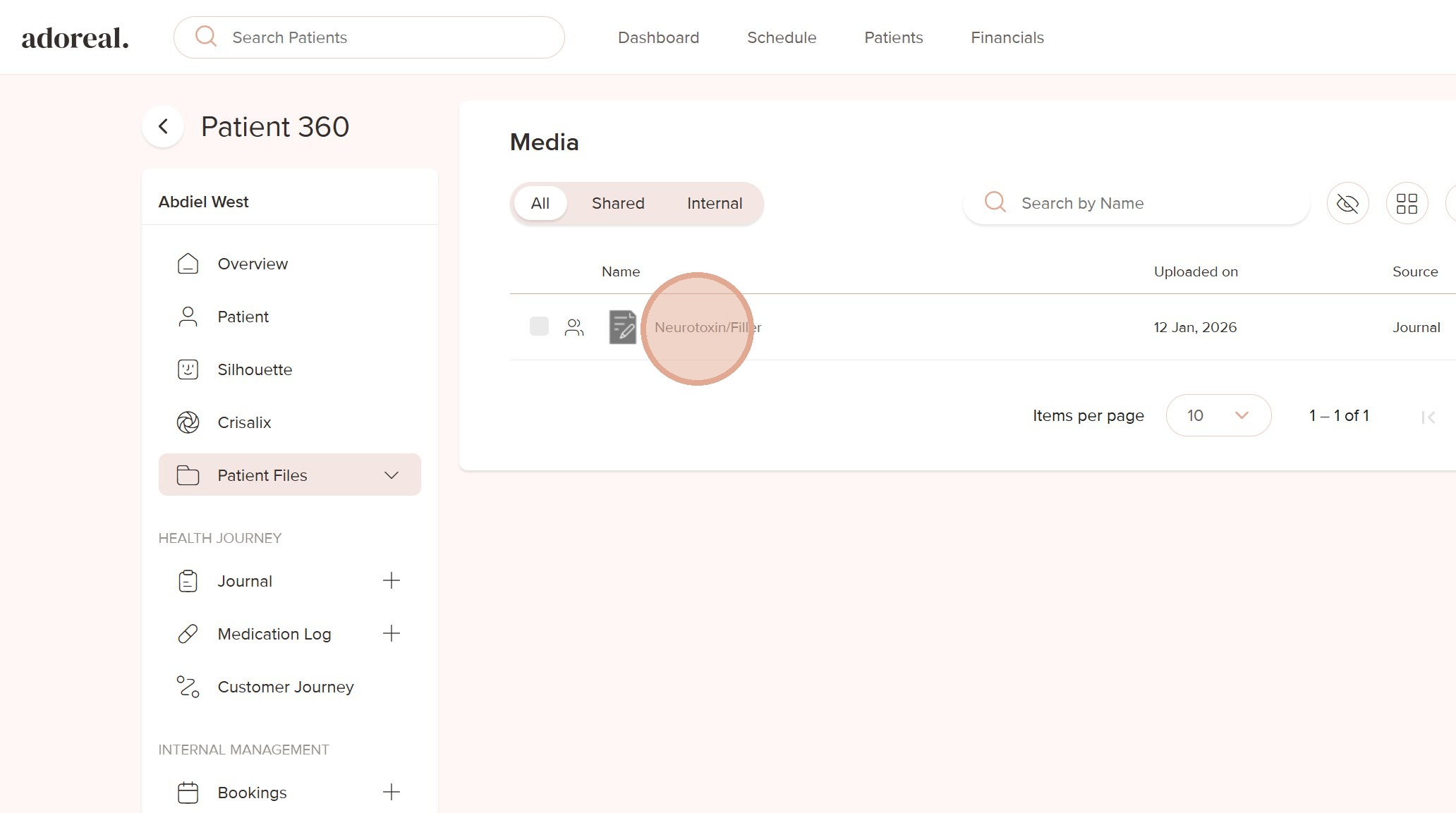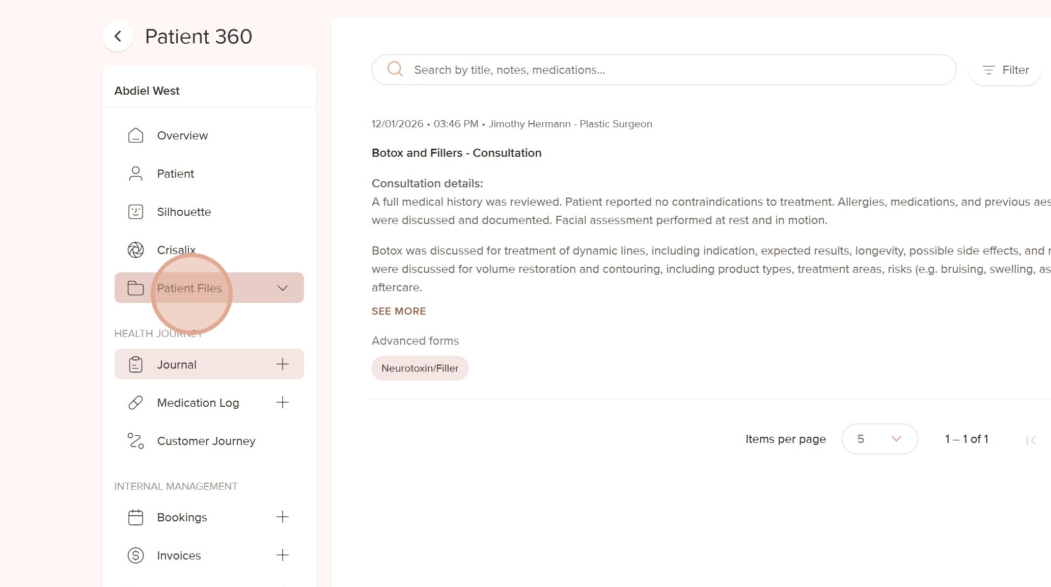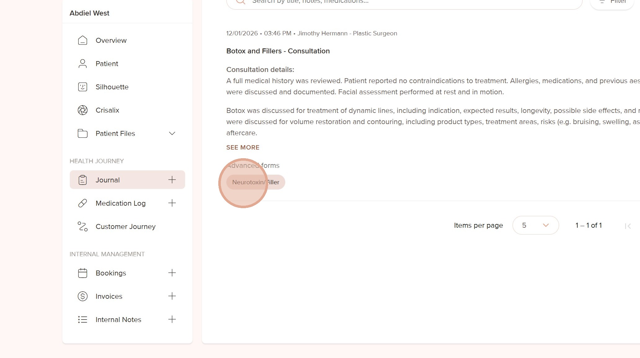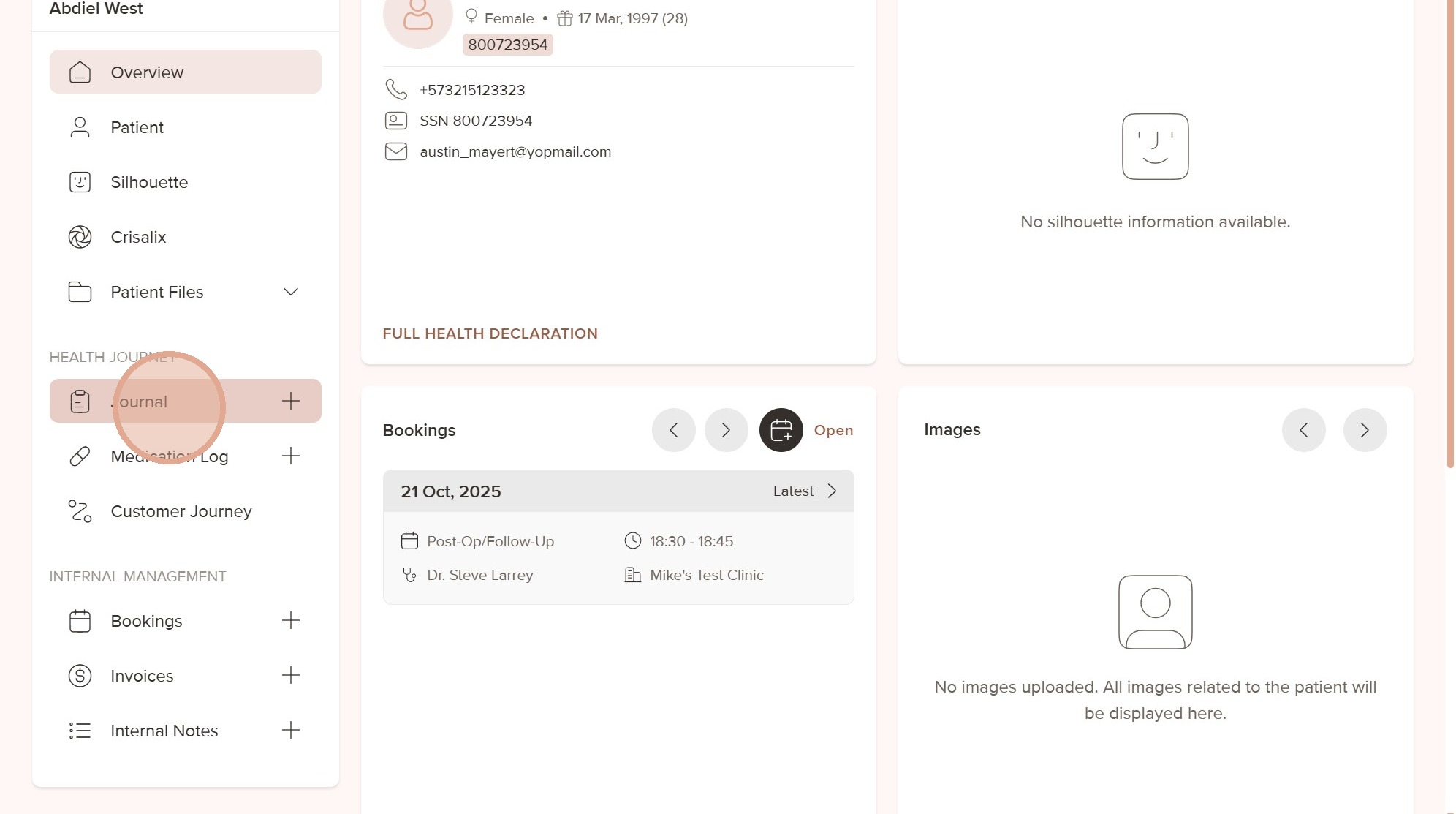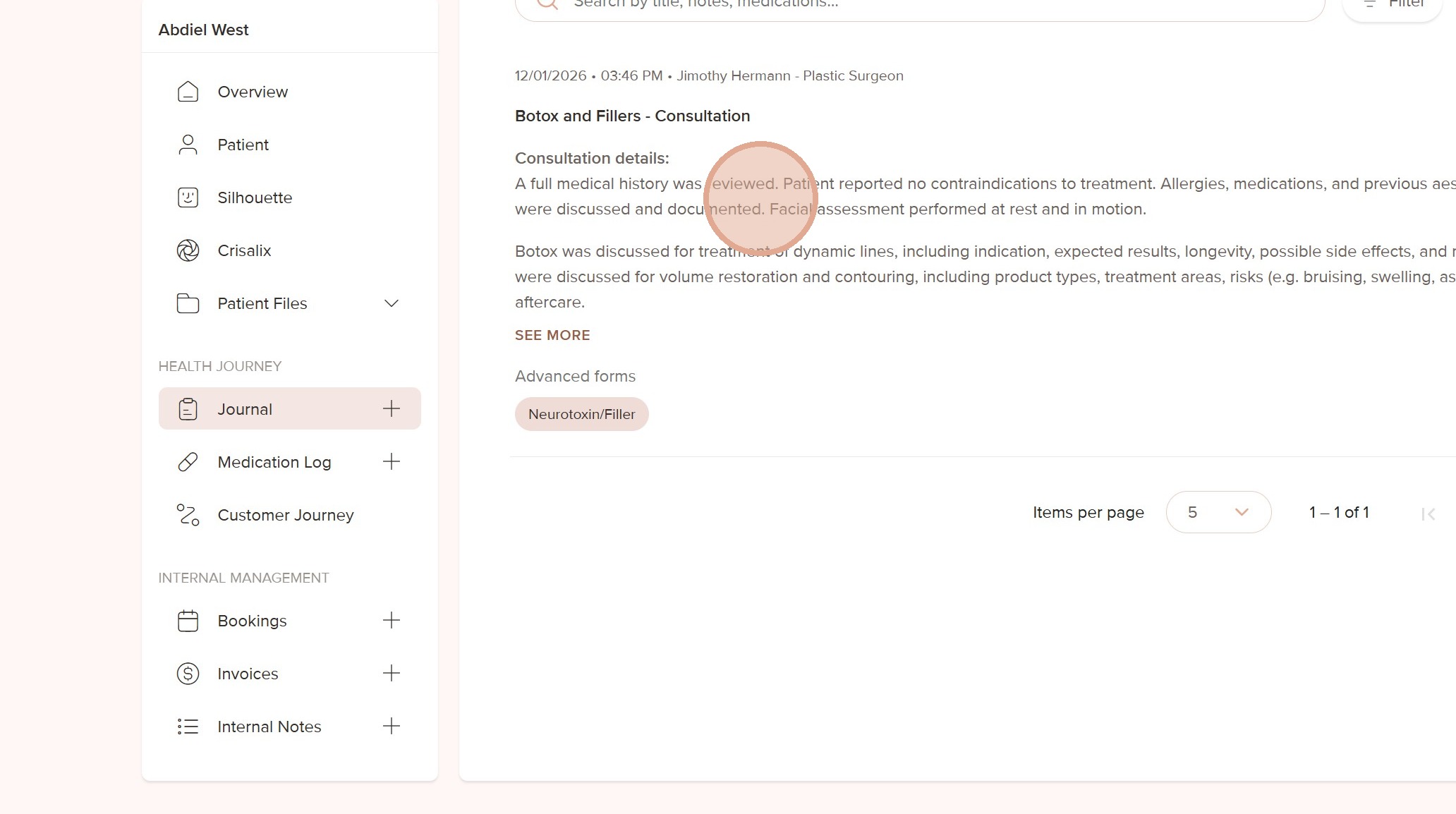 16. After publishing, the journal entry appears in the patient’s Journals.