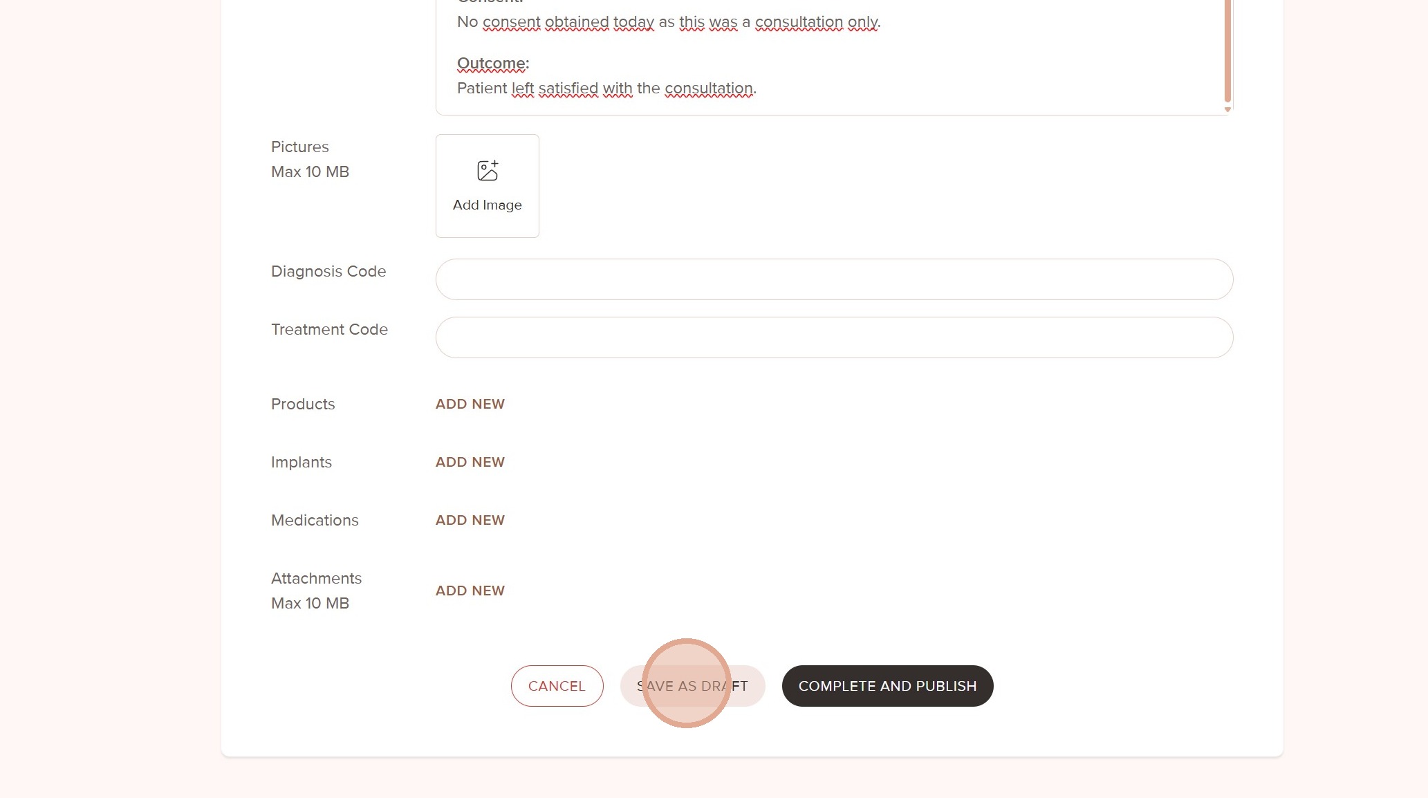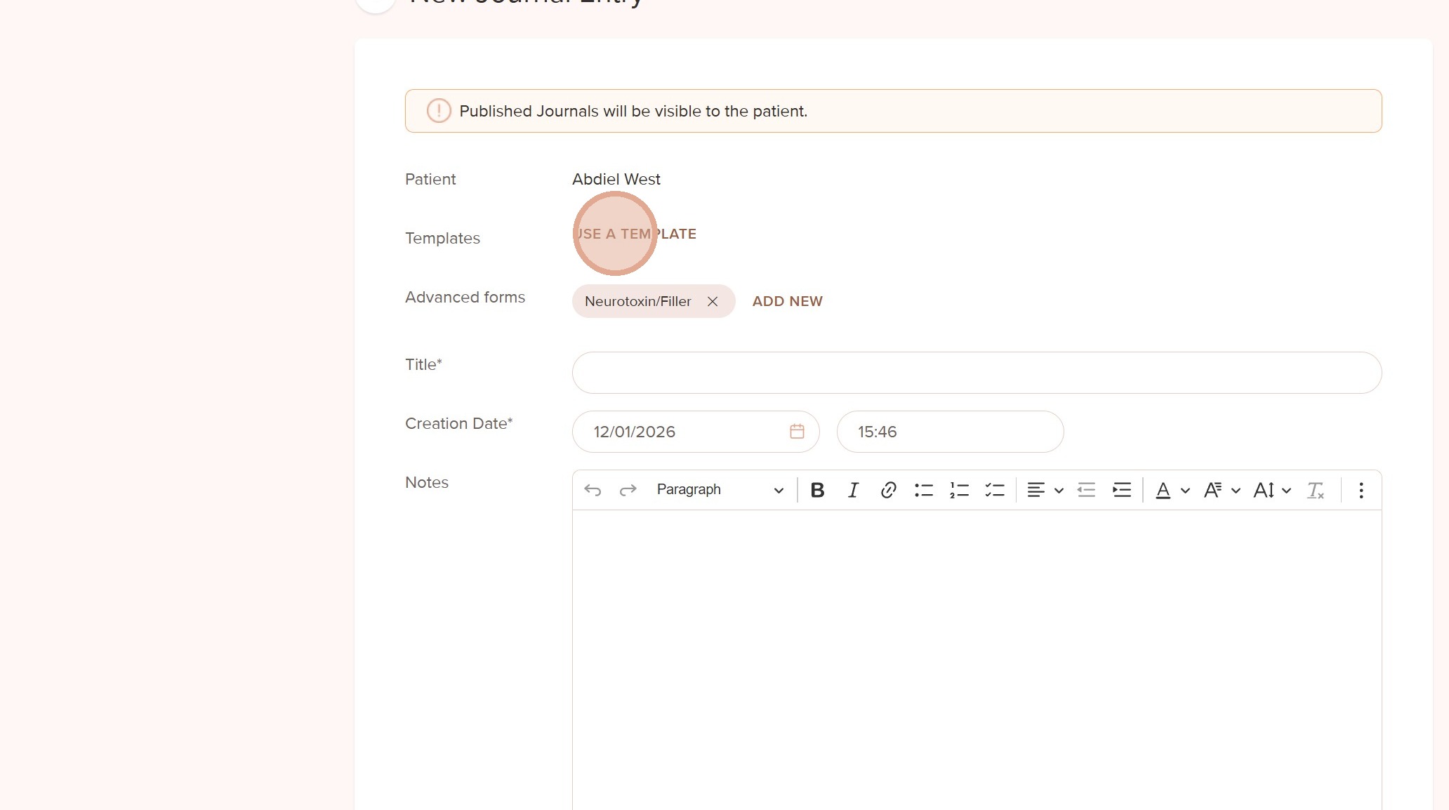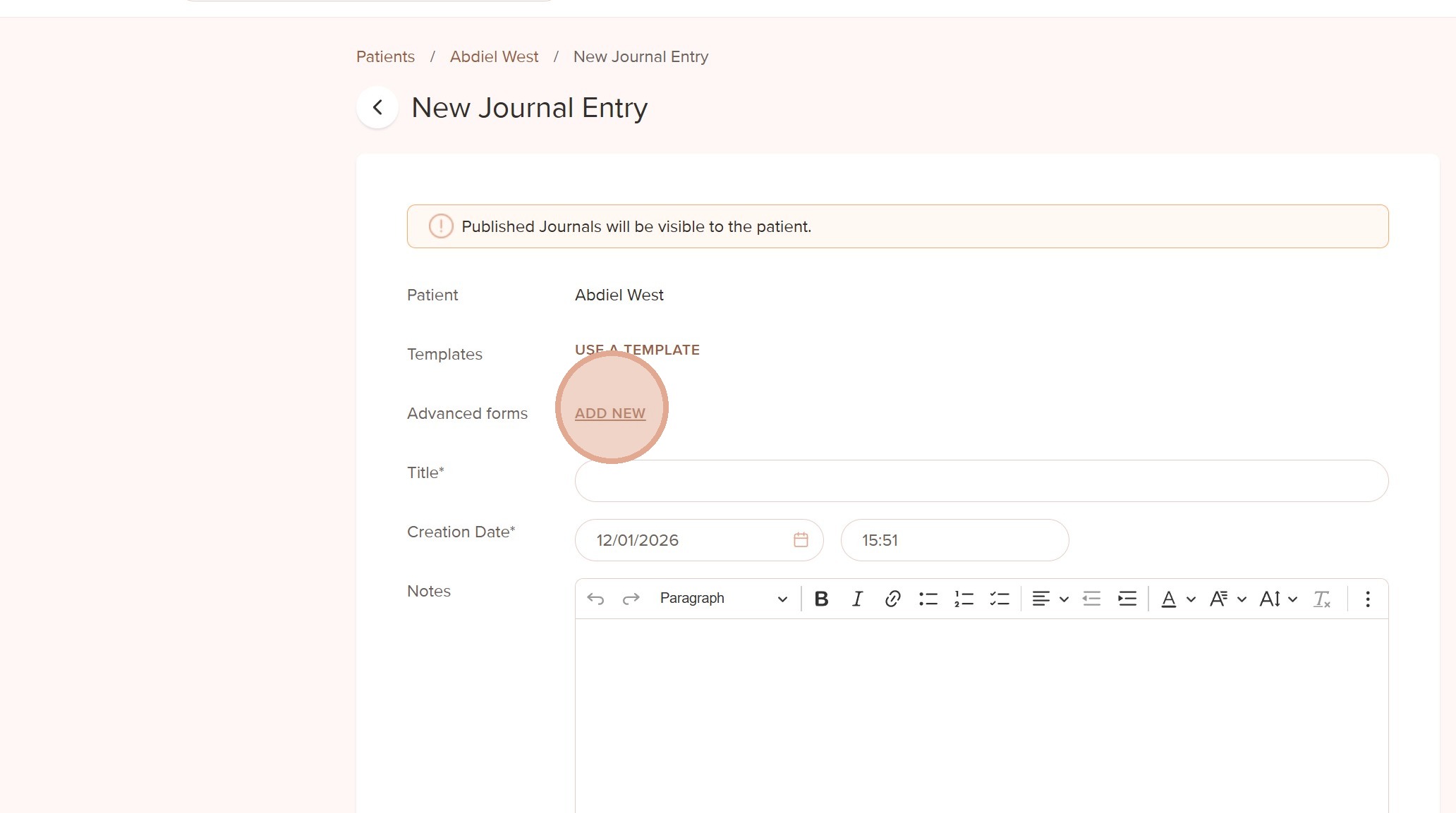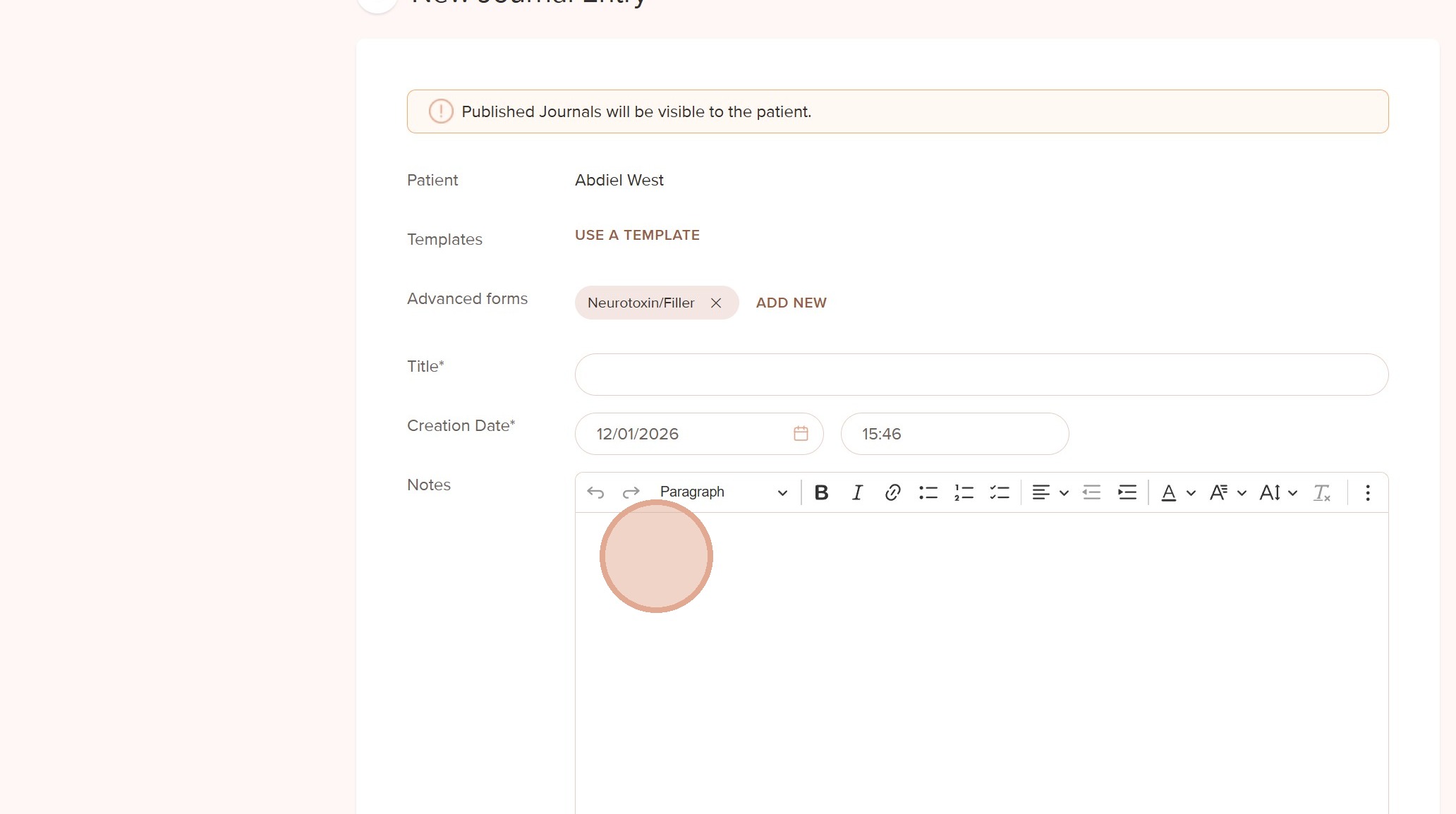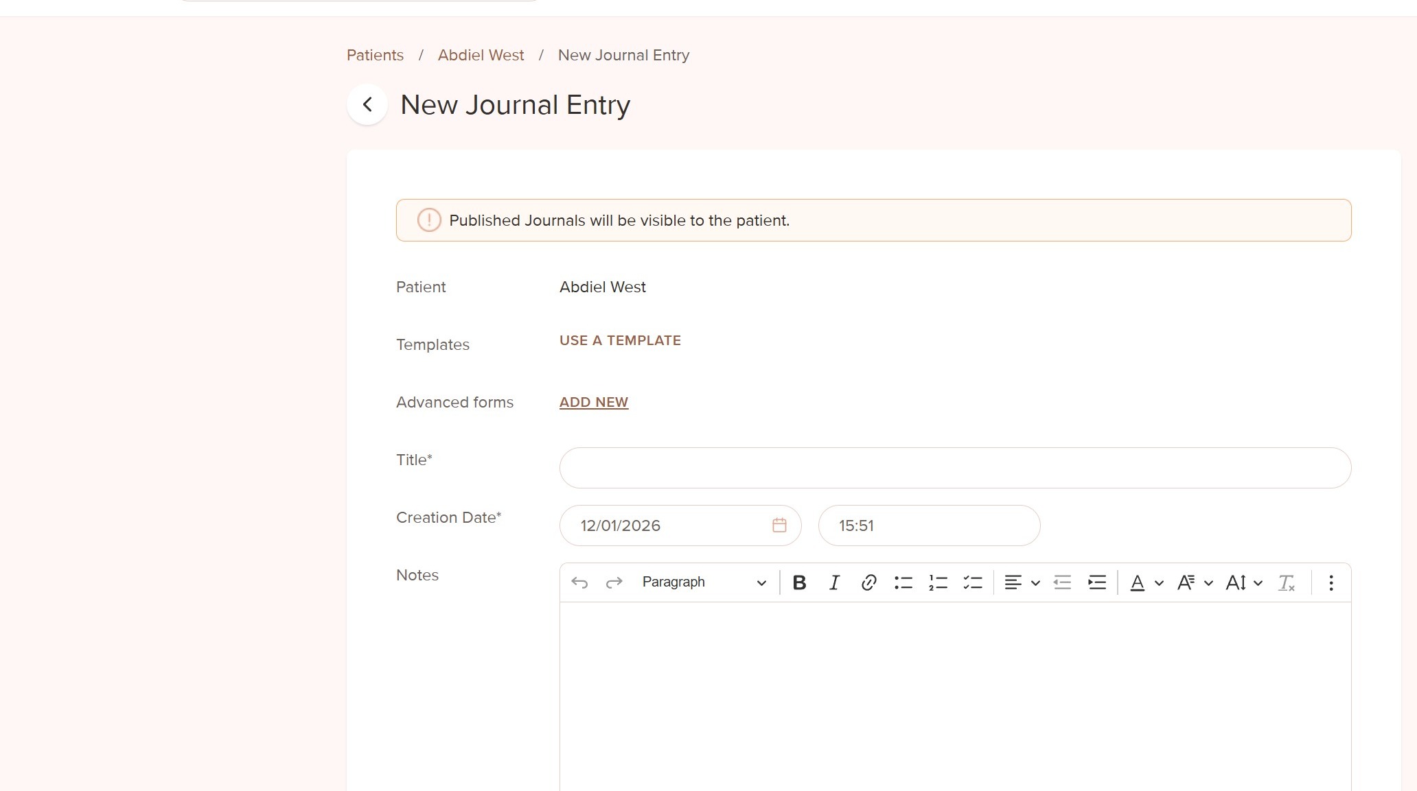 ⚠️ Published journal entries are visible to the patient. If you’re not ready to share the entry yet, you can save it as a draft. Draft entries aren’t visible to the patient but will be automatically published after 2 weeks if not published manually.