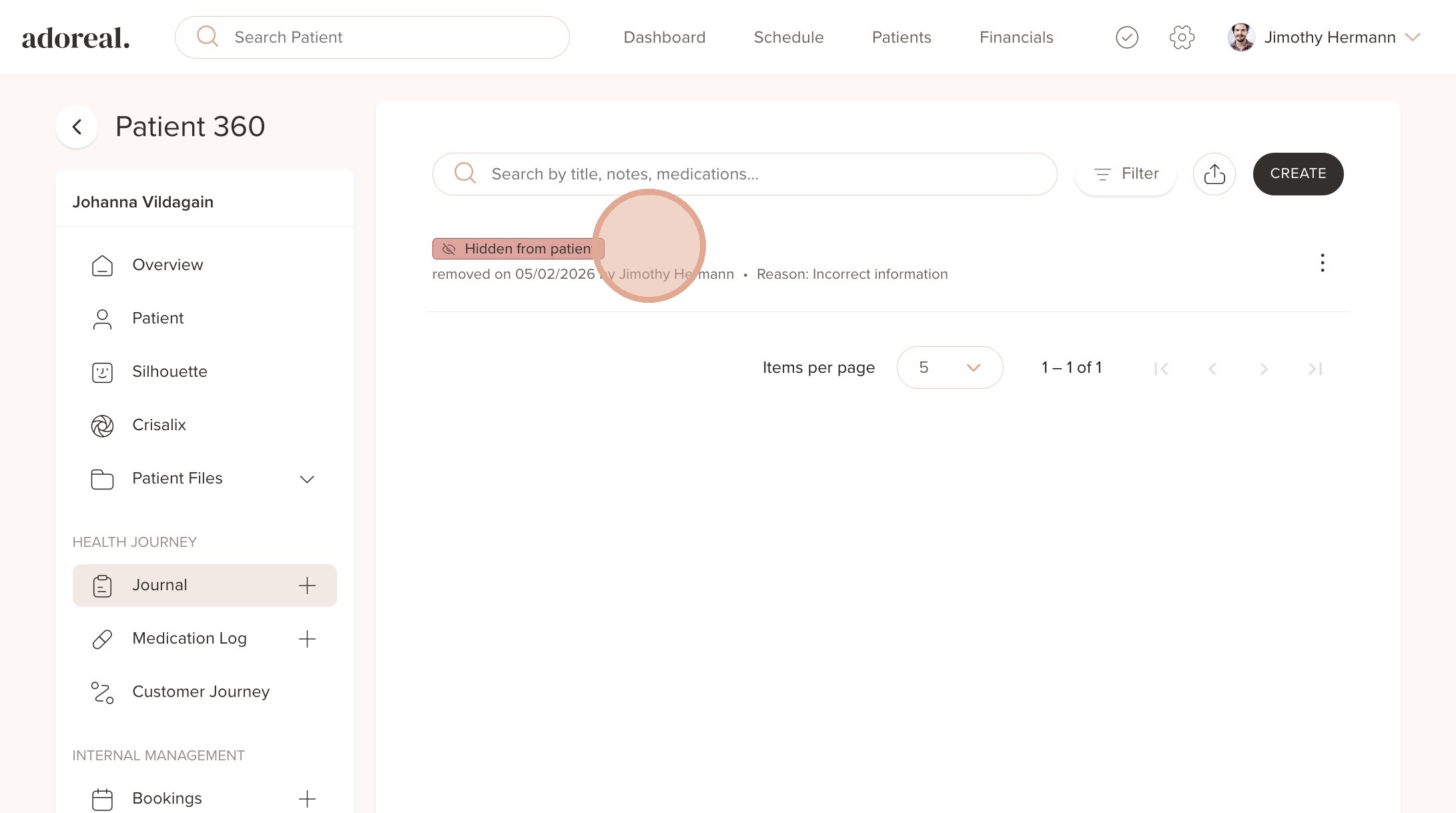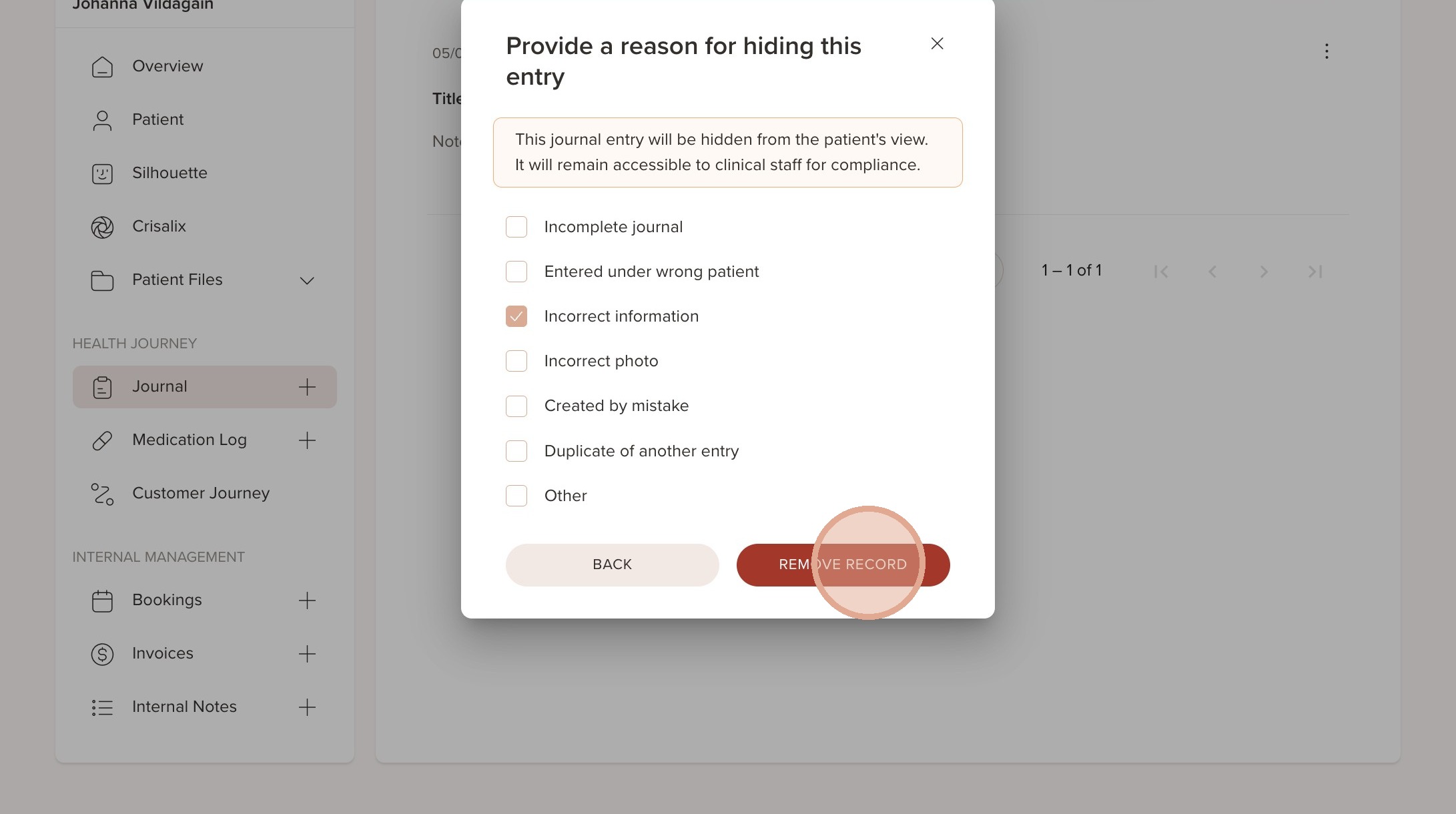 5. The journal has now be hidden from the patient's view but will remain visible to staff for legal and compliance purposes.
