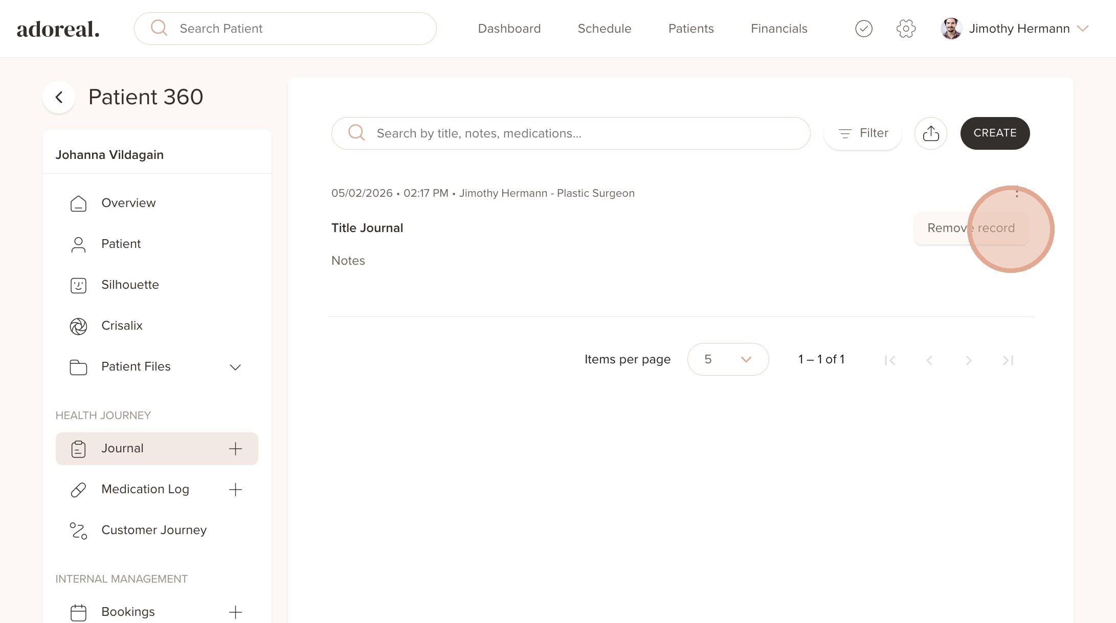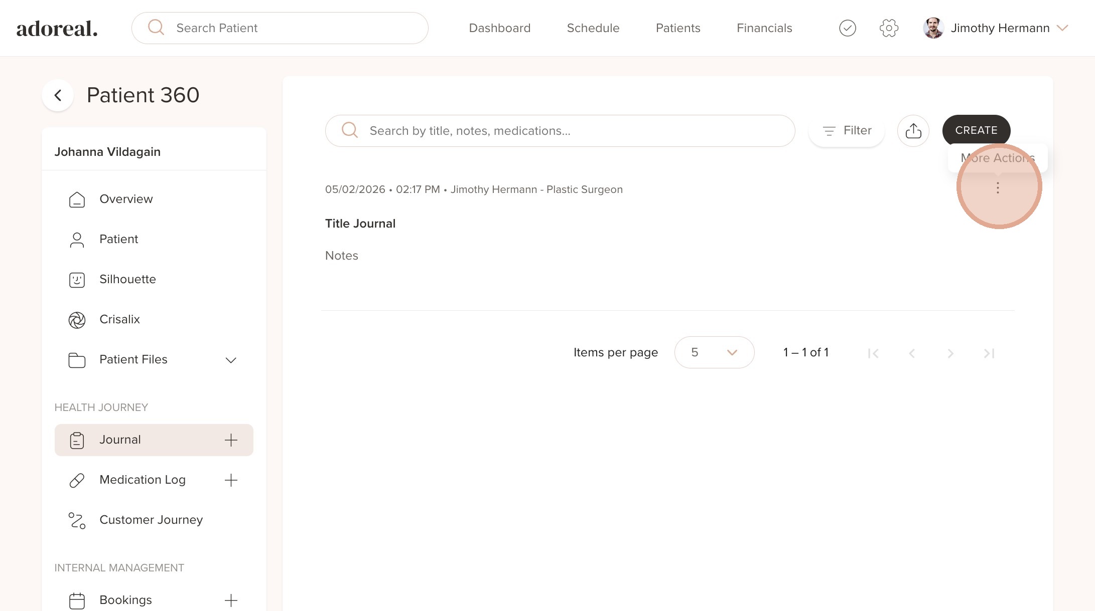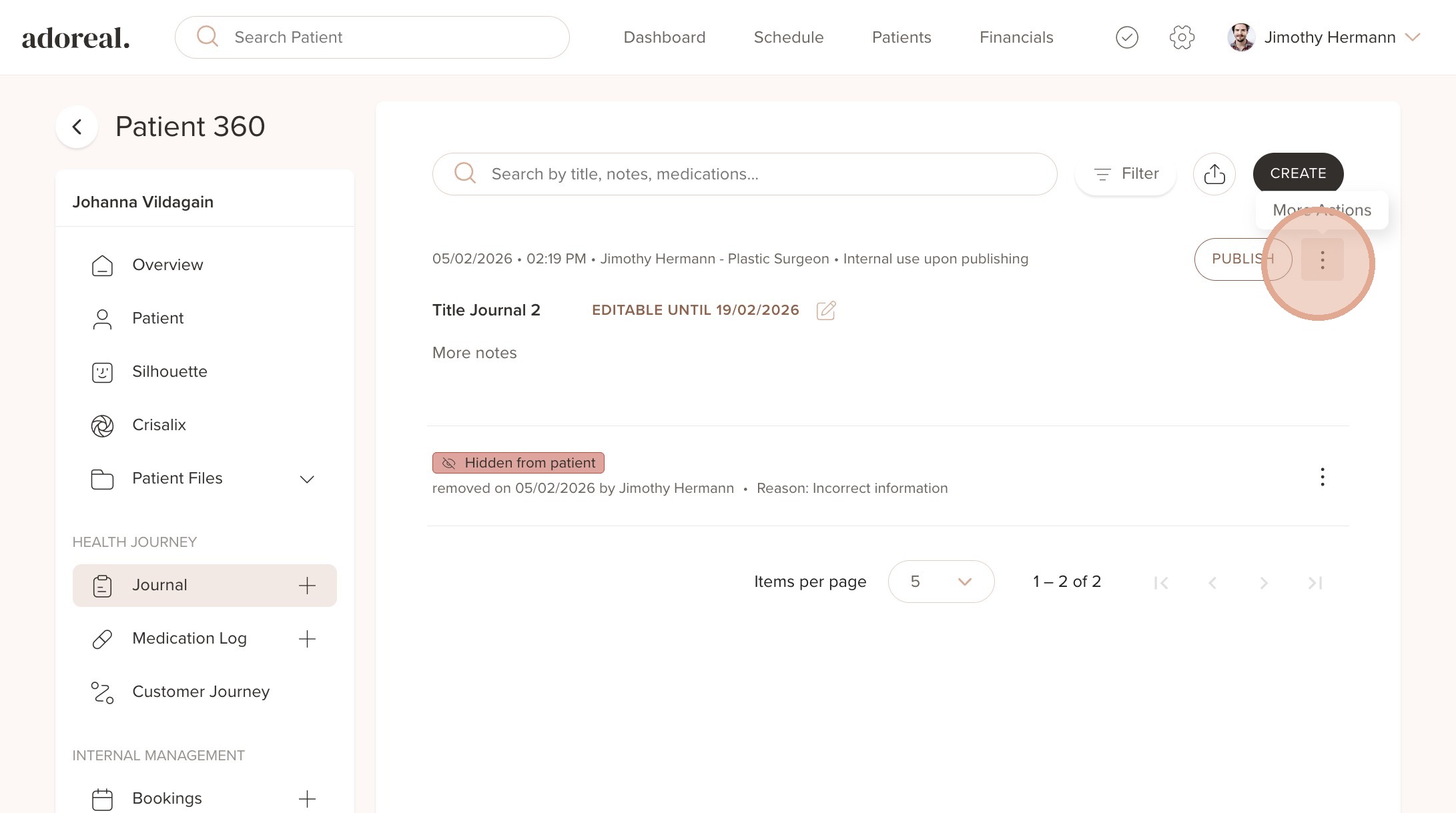 1. To hide a published journal from the patient, go to the Journal entry and then click the three dots (More Actions) next to the journal entry