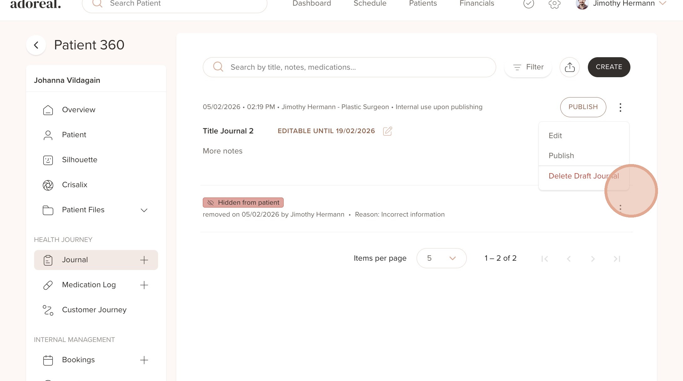This guide shows how to delete draft journal entries and hide published journal entries from patients. This can be useful if a journal entry was created by mistake or contains incorrect information.