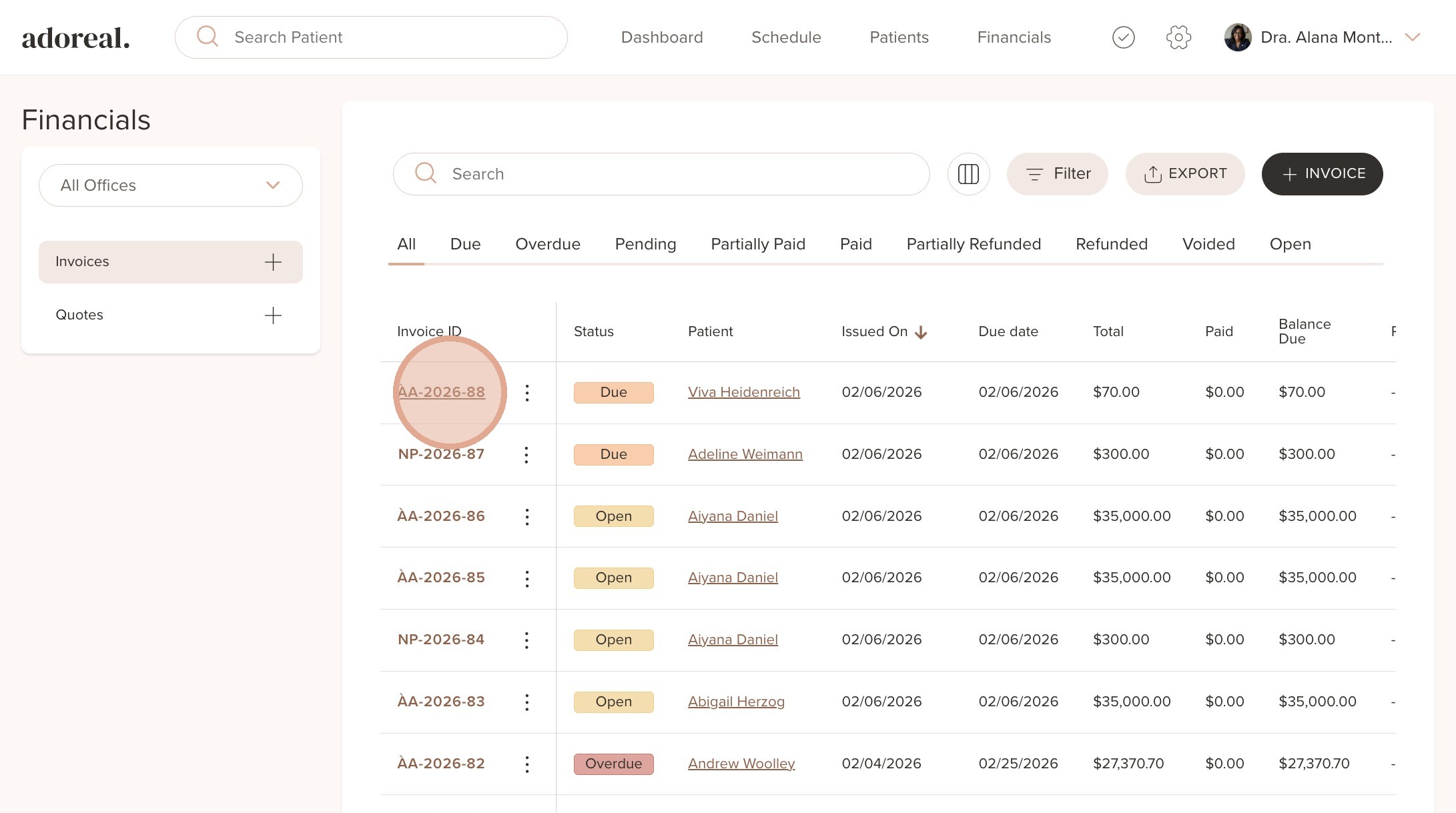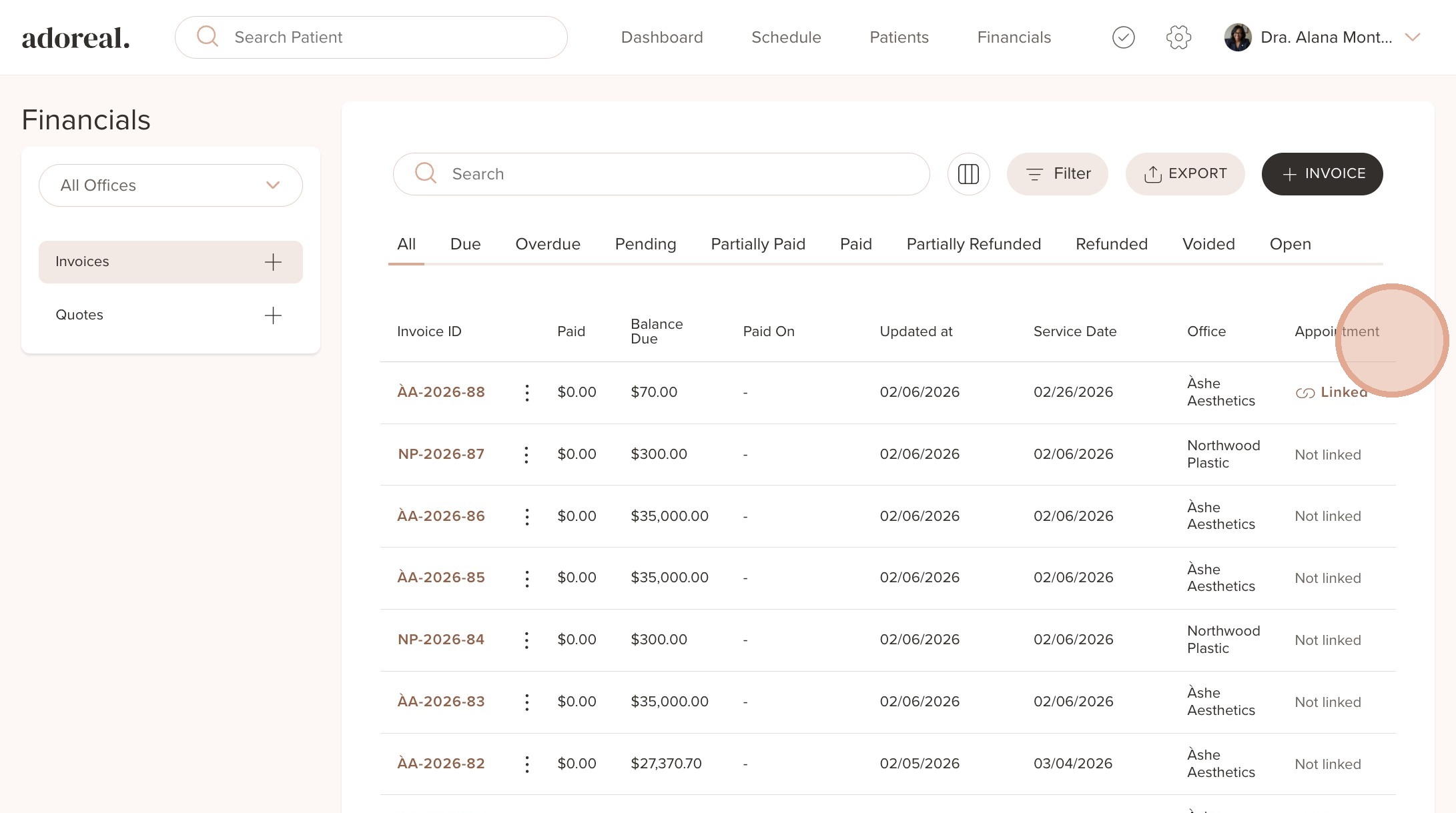 1. Go to Financials in the top menu. Under Appointments, you’ll see a list of all appointments and whether an invoice is linked to the appointment or not.
