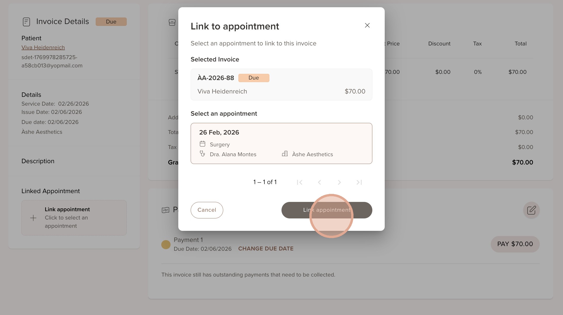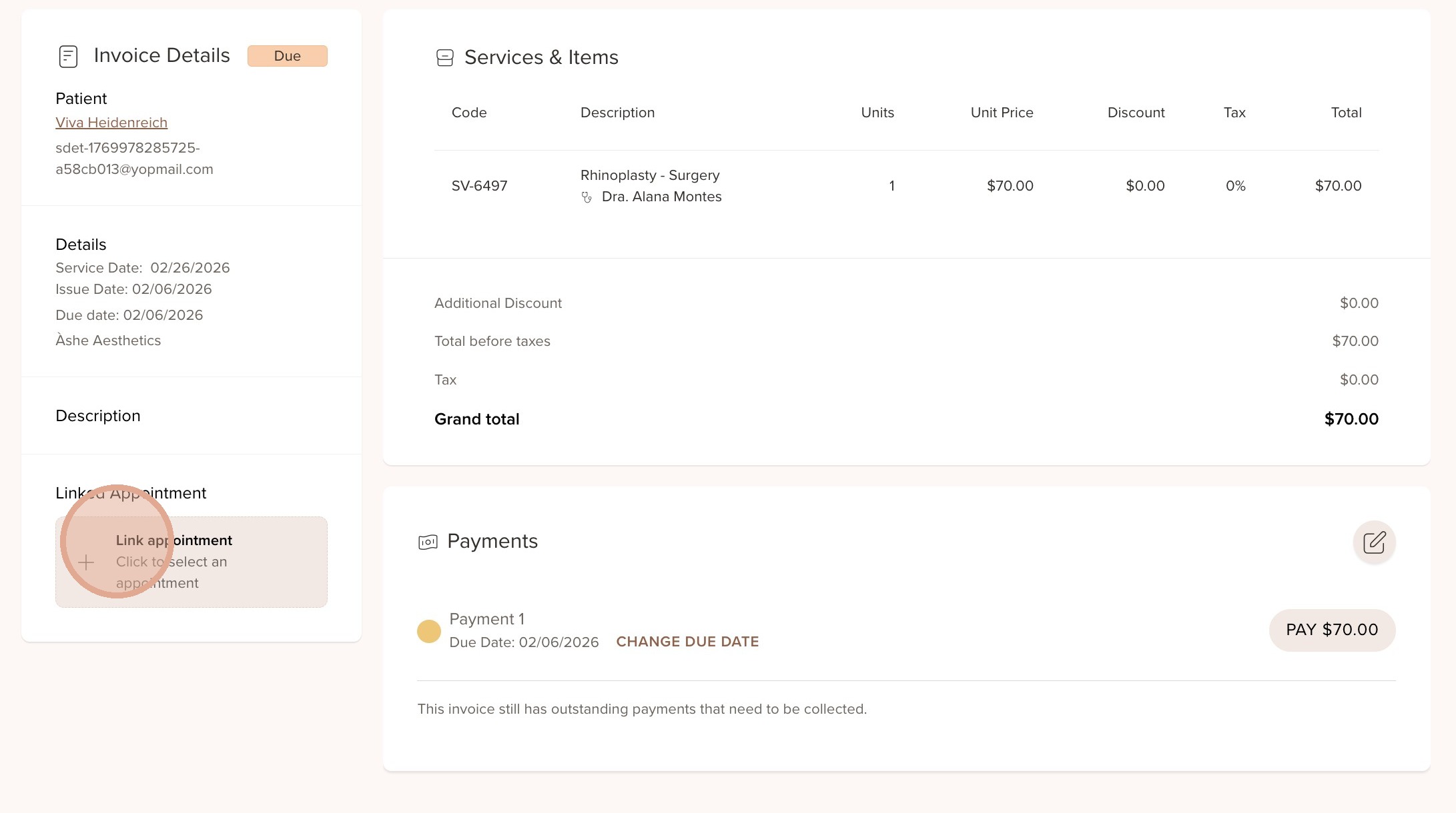 3. From here, you can link the invoice to an appointment. Click "+ Link appointment".